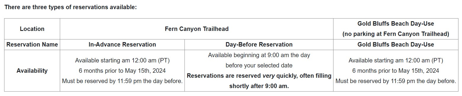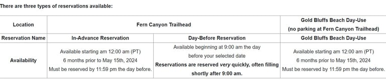 There are several reservations or permits available: In-Advance Fern Canyon Trailhead, Day-Before Fern Canyon Trailhead, and Gold Bluffs Beach Day-Use (no parking at Fern Canyon Trailhead). Please note that the Fern Canyon reservations allow you to continue out to the end of the Davison Road straight to the trailhead where you can park and easily walk the 0.1 mile into the canyon.