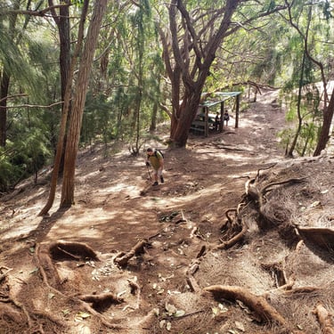 Halfway through the hike, you will arrive at a covered picnic bench. The trail gets steeper after this, with steep inclines and stairs as you hike closer to the summit.