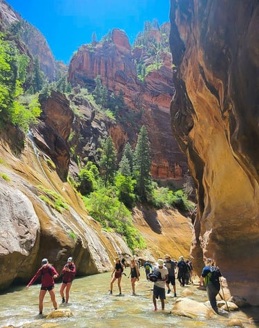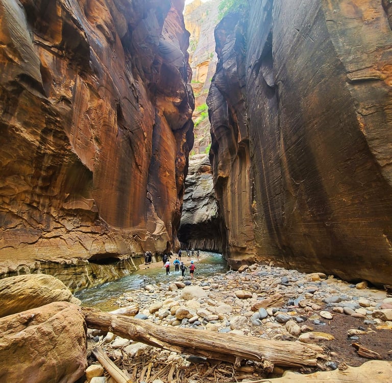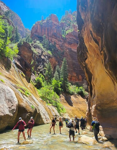 The Top-Down hike starts at Chamberlain’s Ranch, and you would hike all the way down to the Temple of Sinawava. From Chamberlain’s Ranch, hiking 5 miles will take you to the Upper Narrows, and continuing down from that you will reach Deep Creek, which is a good spot for lunch. Afterwards, you’ll reach the lower Narrows where the Bottom-Up hikers are.Write your text here...