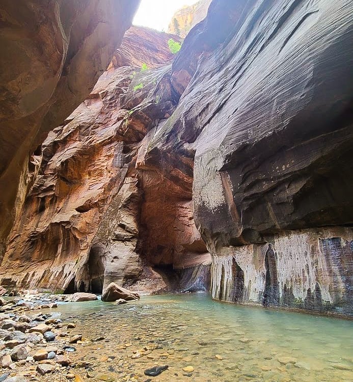 In order to hike the Zion Narrows, you will have to hike in the cold Virgin River (or you can do the walk on the paved trail but it’s not the same), and walk through greasy and slippery rocks (this is unavoidable). However, the views along the way are worth every step of the way! The canyon walls are incredible, words can’t even begin to describe its beauty. Inside the slot canyon, some cliffs will reveal cool stripes (some call it looking like zebra stripes) due to mineral deposits. Some sections of the hike, the water is a beautiful turquoise blue.
