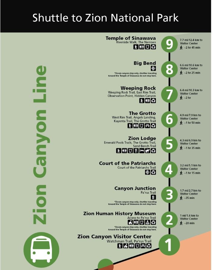 Map of Zion Canyon Line shuttle stops, thanks to National Park Service.