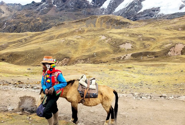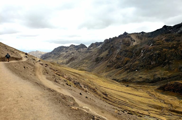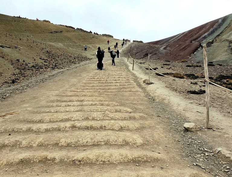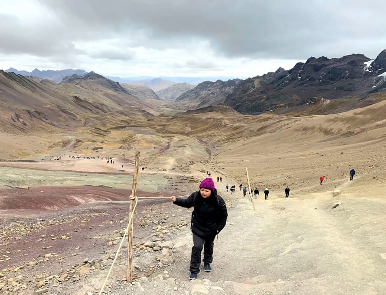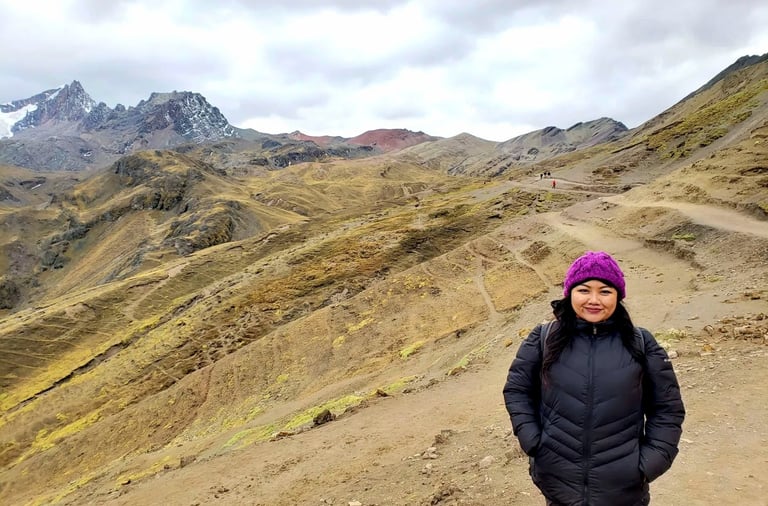 We looked around—and simply, WOW. Mountains stretched in every direction, layered with a kaleidoscope of colors that truly justified the name Rainbow Mountain. The striking hues, revealed only a few years ago as melting snow exposed the mineral-rich layers, made the landscape feel almost otherworldly. At 17,060 feet above sea level, the air was thin, making every breath a conscious effort.
